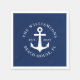 Unique nautical paper napkins with a navy blue and white design that feature a boat anchor and text templates. It's easy to personalize the design with your family name, year, state or another text.