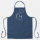 Custom chef apron feature cute chef script and hat with personalized name on navy blue background. Great personalized chef apron.