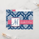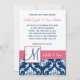Stylish Wedding Invitations in rectangular format with Navy Blue and White Damask Pattern, Monogram, Names with Pink accent colours. Wedding Invitation Design by Elke Clarke ©2009. Graphics licensed for use. Customize with your monogram, names and wedding invitation information. Also, choose from a variety of fonts and beautiful papers to make your wedding invitations FABULOUS! Contact us for alterations in colours at luxuryweddinginvitations@gmail.com