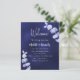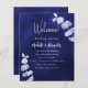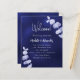 A modern, elegant, wedding program, timeline. A navy blue background, decorated with eucalyptus, sprigs. The blue colour is uneven. Personalize and add your names and wedding details. If you have more text it's possible to reduce the line space. You can also add text on the back.