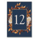 Navy Blue Fall Table Numbers. Add a touch of elegance to your reception tables with the Wedding Number cards from the "Fall Navy Blue Terracotta Floral and Leaves Wedding Invitation Collection." These beautifully designed cards feature the stunning autumn-themed floral and leaves pattern, making it easy for guests to locate their tables while enhancing the overall decor. Elevate your table settings and ensure a cohesive look for your wedding celebration.