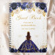 This elegant and glamourous Quinceañera guest book features a beautiful princess with dark hair in a tiara and navy blue ball gown. The text combines handwritten script and modern sans serif fonts for a classy and sophisticated look. The floral arrangements and gold confetti create the perfect blend of rustic and chic.