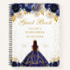 This elegant and glamourous Quinceañera guest book features a beautiful princess with dark hair in a tiara and navy blue ball gown. The text combines handwritten script and modern sans serif fonts for a classy and sophisticated look. The floral arrangements and gold confetti create the perfect blend of rustic and chic.