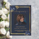 An elegant 2-page program. A dark blue background, a faux gold frame, blue florals and space for a photo. Personalize and add name, dates and your text.