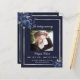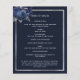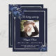 An elegant 2-page program. A dark blue background, a faux silver frame, blue florals and space for a photo. Personalize and add name, dates and your text.