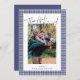 Celebrate Thanksgiving with this elegant photo card featuring a navy blue gingham border and the heartfelt message “Thankful & Blessed.” Easily customize with your own family photo and name to create a warm and timeless keepsake for the holiday season. The back of the card includes ready-to-use Thanksgiving wishes, which you can keep as is or replace with your own custom text.
