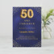 A navy blue, uneven coloured background. Decorated with golden corners. Personalize and add a name and party details. 50 with a balloon style font.