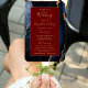 This elegant, modern wedding program fan features a navy blue agate background trimmed with gold faux glitter. The text appears in elegant gold-coloured handwriting and copperplate fonts on a burgundy red rectangle.