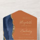The left-hand edge of this elegant modern all-in-one wedding invitation and RSVP features a navy blue watercolor agate border trimmed with faux gold glitter. The customizable text combines gold-coloured handwriting, copperplate and italic fonts on a burnt orange background. The return address appears on the outside flap and the reverse side of the detachable RSVP card in gold-coloured text on solid burnt orange.
