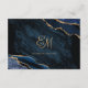 This modern luxury wedding reception card features a chic trendy navy blue and gold agate gemstone background, with an elegant script monogram of the bride and groom on the back.