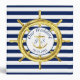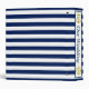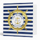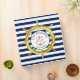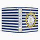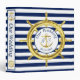 Keep your photos and memories of your special wedding day in this nautical binder. A gold ship’s wheel contrasts with the classic navy blue and white stripes. In the centre a gold anchor is flanked by the monograms of the bride and groom.