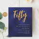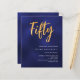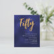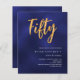 A modern, stylish invitation for a 50th birthday party for both him and her. The blue colour is uneven. Navy blue background and the word Fifty written with large faux gold letters. Personalize and add a name and party details. White text.