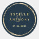 This wedding sticker features a faux gold circle frame with an elegant ampersand and simple calligraphy with a navy blue background.