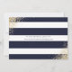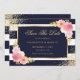 Elegant navy blue and white striped floral wedding save the date cards featuring watercolor blush pink flowers and gilded greenery. Matching items available.