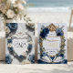 Set the tone for a sophisticated evening with this romantic Swan Lake design. Features deep navy florals and an ornate faux gold frame for a fairytale vibe.This design centers on two graceful white swans curving their necks to form a heart shape, set against a printed marble background texture. The artwork is framed by an ornate, baroque-style oval border rendered in a simulated 3D gold foil effect. Lush bouquets of deep navy and dusty blue roses mixed with eucalyptus greenery adorn the corners. The text utilizes a modern calligraphy script in a faux gold glitter color.This is a flat printed image with a faux gold foil and glitter effect, not actual raised foil or metallic material.