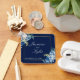 Elegant blue and white roses decorate this beautiful floral evening wedding keychain. The chic faux gold foil frame is accented with pretty indigo watercolor flowers and a lovely light yellow botanical sprig. The couple's names are written in classic white cursive script within the square border of this modern winter reception favour for a contemporary bride.