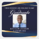 This elegant navy blue and gold graduation party sticker features modern geometric lines around your formal text and senior portrait photo. The classy white script details your graduate school and class information next to your photograph. These upscale senior stickers are perfect for a 2025 college or university grad.