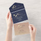 Elevate your wedding with this elegant navy blue and gold script all-in-one wedding invitation. Featuring a sophisticated gold calligraphy design, customizable details, and a romantic photo back, this eco-friendly invitation is perfect for couples seeking a classic, luxurious style. Easily personalize with your details.