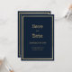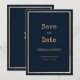 A vintage navy blue and gold theme typewriter with gold font typography rustic style wedding Save the Date invitations. Is perfect for any refined and sophisticated girl or anyone. This design is ideal for a trendy and elegant party event. Customize this design with your message and personalized information. All designs are printed.