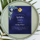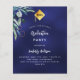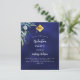 A navy blue background, decorated with greenery. The blue colour is uneven. Personalize and add a name and party details.