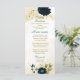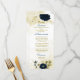 Beautiful navy blue ivory white and gold flowers with pretty leaves wedding menu.