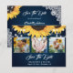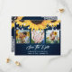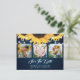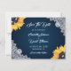 Rustic navy blue floral wedding photo save the date cards featuring sunflowers and white floral lace on a navy gradient background. Easily personalize this card with your images and wedding details. Matching items available. The background may be changed to any colour.