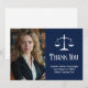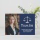 Elegant navy blue lawyer thank you cards with the scales of justice next to your graduation or office photo. Customize these law school cards of thanks with chic white script next to your attorney photograph.