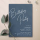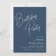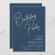 Modern minimal birthday invitations with "Birthday Party" in a handwritten style script font. White text on a dark blue background. Casual birthday party invites that can be changed to any age.