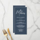 This modern menu features elegant white fonts on a navy blue background. You can add your details in the customize menu. This menu is part of a beautiful matching wedding suite that can be fully personalized.