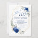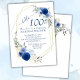 Elegant watercolor navy blue floral 100th birthday invitations with gold frame for her in pretty blue flowers.