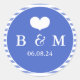 NewparkLane - Modern design, personalized Round Sticker, with a navy blue striped pattern and a blue frame with a heart and your personal monograms in elegant font.