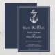 Announce your upcoming wedding day with this Navy Blue Nautical Anchor Save the Date Invitation. Invite design features a nautical anchor with a rope, elegant script and modern typography. Perfect for couples who want a coastal chic look to their coastal wedding theme.