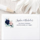 These stylish and trendy wedding return address labels feature a white background with nautical coloured watercolor flowers and green leaves. Your names and return address appear in modern, dark navy blue text and script typography.