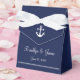 Navy blue nautical wedding favour boxes (tent favour box with white ribbon) with anchor and customizable text - you can add bride's and groom's name and wedding date.