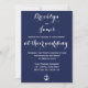These are navy blue nautical wedding invitations, when bride and groom are hosting the wedding, with white anchor printed on both sides of the card. Text is fully customizable, names of the bride and groom are contemporary hand lettered. It's standard 5 inches by 7 inches rectangle flat card, but you can get rounded card too. You can change the dimensions with click on Customize it! and then Size & Paper Options on the right. Cards can be larger (6.5 inches by 8.75 inches) or smaller (3.5 inches by 5 inches - RSVP card size). Each card is delivered with standard white envelope (5 inches by 7 inches). You can also opt for different paper type. This one for instance is 110lb with 12.5 point thickness semi-gloss paper, but other options are available too - ultra-thick, columned and champagne shimmer rare just few of them.