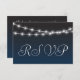 An elegant modern Wedding RSVP Response Card in a navy blue watercolor ombre effect with faint brush strokes. To the top of the co-ordinating card are two strings of sparkling string lights with the background serving as a faux night sky.