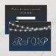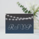 An elegant modern Wedding RSVP Response Card in a navy blue watercolor ombre effect with faint brush strokes. To the top of the co-ordinating card are two strings of sparkling string lights with the background serving as a faux night sky.