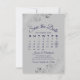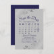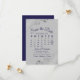 This Save the Date card features a beautiful design with navy blue script lettering on a grey background, and frilly faux foil silver frills in the corners. There is a customizable calendar where you can put a heart around your wedding date. There is space for the couple's name, wedding location, and website. Elegant and chic way to let your friends and family know to save the date for your special day.