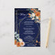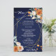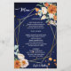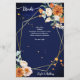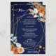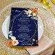 Orange and white roses sage eucalyptus greenery navy blue background gold geometrical frame floral menu template with drinks list at the back, if you dont have drink, can utilise to write program, or something else, or leave it blank.