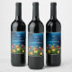 Labels for the wine of hour home, house wine! Tropical birds, parrots in blue, yellow and red sitting on green palm leaves. Decorated with tropical flowers. A dark blue sky as background. The blue colour is uneven. Template for a the name of your house, beach house, event place and a year. White hand lettered style script. Template for an event: birthday party (any age) bridal shower, weddings, wedding anniversary.