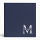 featuring personalized white monogram in classic serif font style with box of name in the middle of monogram on navy blue background.