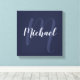 featuring name in white modern script font style and monogram in light navy blue modern script font style as background on navy blue background.
