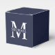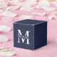 featuring personalized white monogram in classic serif font style with box of name in the middle of monogram on navy blue background.