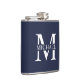 featuring personalized white monogram in classic serif font style with box of name in the middle of monogram on navy blue background.