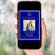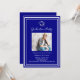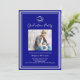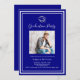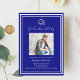 Navy blue background, decorated with a white frame, and a faux silver graduation cap. Personalize and add a photo name and details. White text.