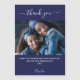 A navy blue background colour. White, large hand lettered script with swashes and the text: Thank You. Personalize and add your photo, thank you note and name.