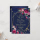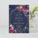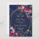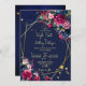 Pink burgundy roses greenery navy blue background gold geometrical frame floral wedding invitation template with QR RSVP code at the back.