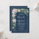 Features a spray of silver dollar and seeded eucalyptus over a navy blue watercolor wash background with a gold border. Design also features elegant floral elements of roses & peonies in dusty rose or blush pink for a unique look.