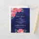 A trendy, modern bridal shower invitation. A dark blue navy blue background. The blue colour is uneven. Decorated with lush pink watercolored peonies flowers, florals and som grey green greenery. Templates for the bride to be's name and party information. The name and is written with a modern hand lettered style script. White text.