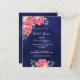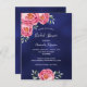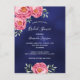 A trendy, modern bridal shower invitation. A dark blue navy blue background. The blue colour is uneven. Decorated with lush pink watercolored peonies flowers, florals and som grey green greenery. Templates for the bride to be's name and party information. The name and is written with a modern hand lettered style script. White text.
